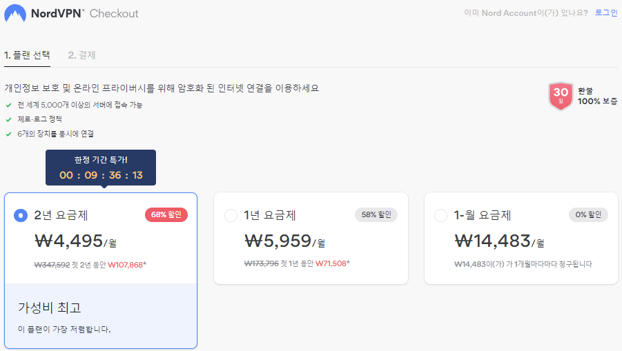 먼저 가격 정책(플랜)을 결정합니다. 가입 기간 길수록 할인률이 매우 크기 때문에 지속적으로 사용하실 거라면 기간을 길게 가져가는 것이 좋습니다. 30일동안은 100% 환불이 가능하기 때문에 장기 가입 대신에 굳이 월 요금제를 써보시지 않아도 됩니다. 장기로 가입하고, 맘에 들지 않으면 30일 이내에 바로 환불하시면 됩니다.