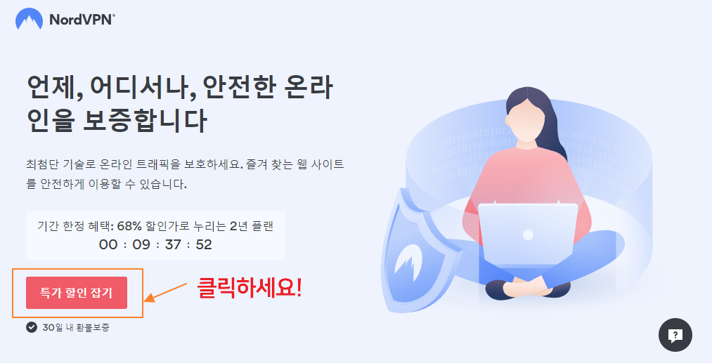 노드 VPN 사이트에 접속하면 다음과 같은 초기 화면이 나오는 데, 가입을 위해 하단의 빨간 버튼을 클릭합니다.