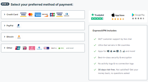Step 3은 결제 방식을 결정합니다. 신용카드도 가능하며, Paypal, 심지어 Bitcoin도 가능합니다.