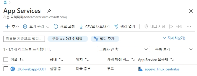몇 분이 지나고 나면, 아래와 같이 해당 Subscrpiton에 Web App이 생성된 것을 볼 수 있습니다.