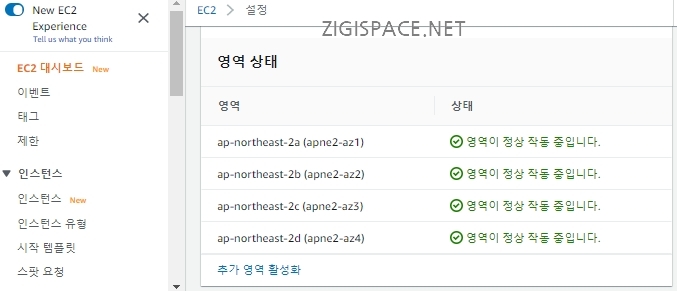 한국 리전의 영역 상태는 다음과 az-1 ~ az-4까지 모두 4개가 보이는 것을 확인 할 수 있습니다.