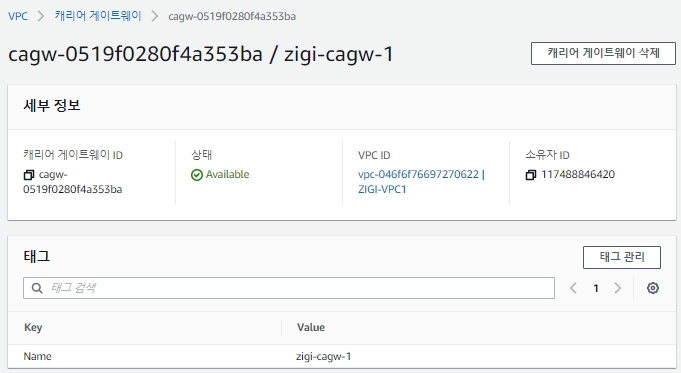 그리고 Carrier Gateway와 함께 자동으로 만들어진 라우팅 테이블을 확인해 보면,