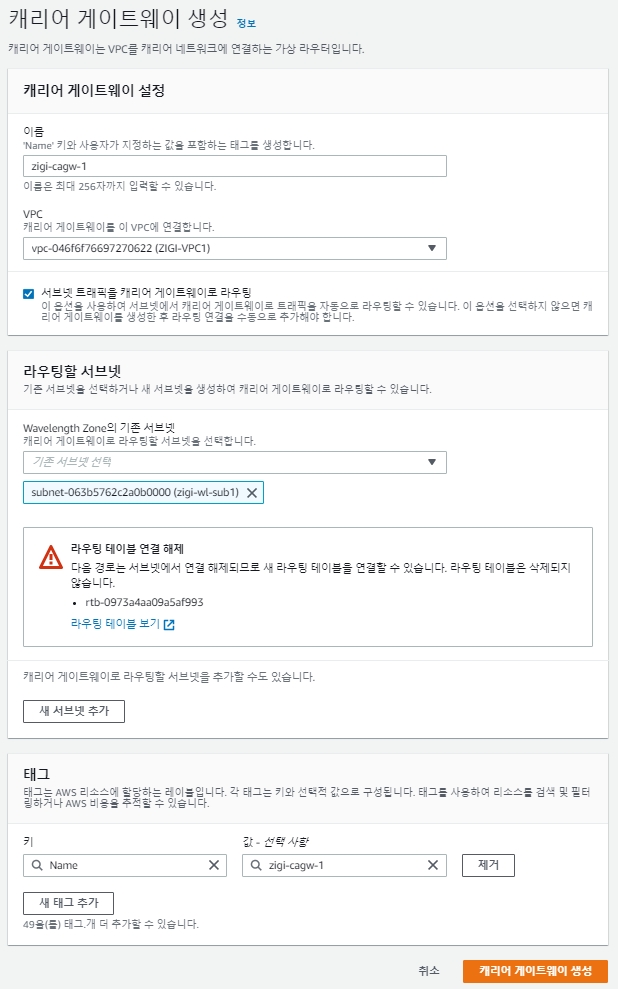 이제 Wavelength Zone을 이용해서 서브넷을 생성할 때 안내 창에 나왔던 Carrier Gateway를 생성합니다.