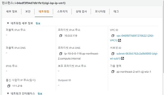 통신사 IP 자동 할당을 활성화 해서 EC2를 생성하면 다음과 같이 통신 사업자 IP가 할당 된 것을 볼 수 있습니다.