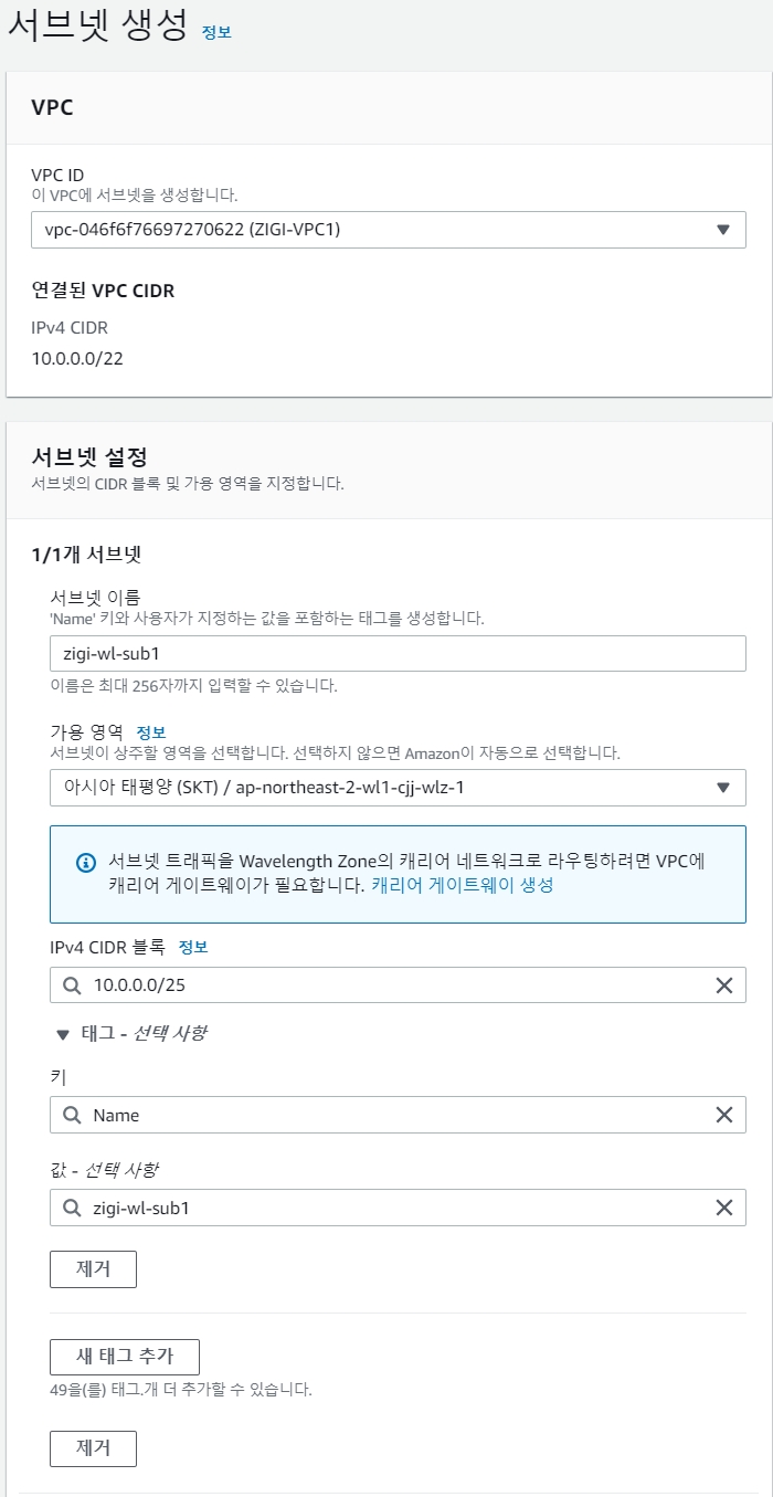 Wavelength Zone을 이용한 서비스 사용을 위해서 먼저 서브넷을 만듭니다.