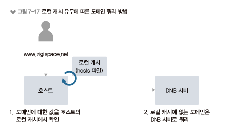 그림 7-17은 zigispace.net 이라는 도메인을 쿼리하기 위해 먼저 로컬 캐시를 조회하고 로컬 캐시에 없으면 DNS 서버로 다시 쿼리해 도메인 쿼리를 수행합니다.