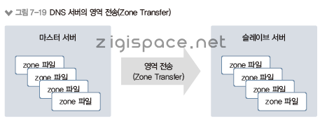 역을 생성하고 레코드를 직접 관리하지만 슬레이브 서버는 마스터 서버에 설정된 도메인이 가진 레코드값을 정기적으로 복제합니다. 그림 7-19은 이런 영역 전송을 도식화한 그림입니다.
