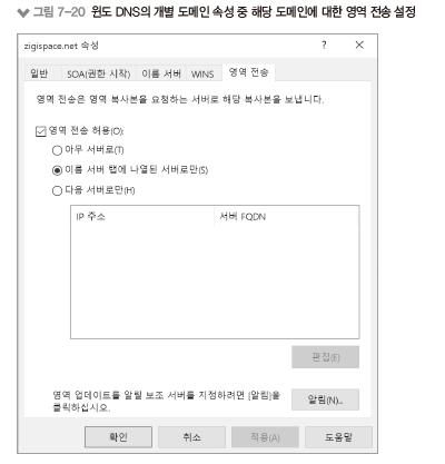 도메인 영역 전송을 위해 슬레이브 서버를 만들 때 도메인을 복제해올 마스터 서버 정보를 입력해야 합니다. 마스터 역할을 하는 서버에서는 자신이 가진 도메인 정보를 인가받지 않은 다른 DNS 서버가 복제해가지 못하도록 슬레이브 서버를 지정해 복제를 제한할 수 있습니다. 마스터에서 별다른 설정을 하지 않으면 무제한 복제가 가능하므로 보안을 위해 복제 가능한 슬레이브 서버 정보를 반드시 입력하는 것이 좋습니다. 그림 7-20의 윈도 DNS에서 개별 도메인별로 영역 전송에 대한 옵션을 보면 영역 전송의 허용 여부나 영역 전송을 허용할 대상 서버를 지정할 수 있습니다.