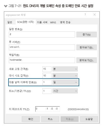코드에 설정됩니다. 만료 시간 안에 슬레이브 서버가 마스터 서버에서 존 정보를 받아오지 못하면 슬레이브의 존 정보는 사용할 수 없게 됩니다. 따라서 만료 시간 안에 마스터 서버를 복구하거나 슬레이브 서버를 마스터로 전환해야만 서비스 장애를 막을 수 있습니다. 이런 도메인 타이머 관련 설정은 7.2.4 DNS 주요 레코드에서 다룰 SOA 레코드에서 지정할 수 있습니다. 그림 7-21은 윈도 DNS에서 도메인 만료 시간을 설정하는 SOA 레코드 설정의 예입니다.