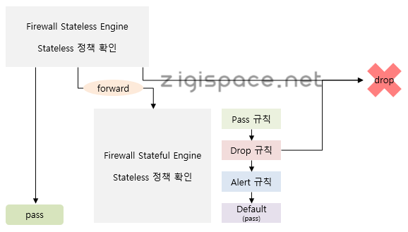 ▪ Stateless 엔진을 먼저 적용하고, Stateless 엔진에서 pass/drop이 아닌 Forward 설정이 해당하는 경우에만 Stateful 엔진 적용.
