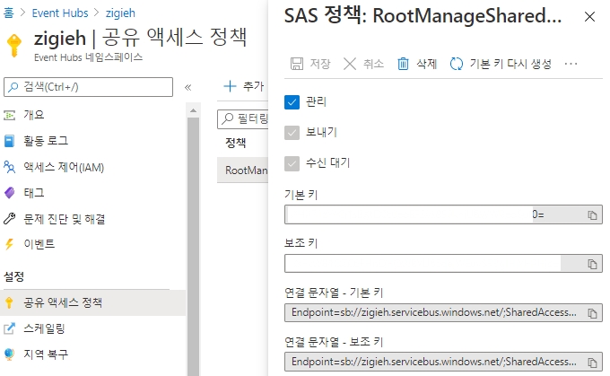 이 정보는 Event Hubs 네임스페이스의 '공유 액세스 정책'을 확인하면, 연결 문자열이 있습니다.