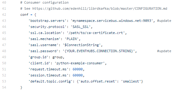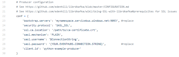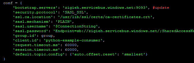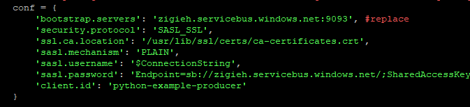 수정이 필요한 부분은 23번째 줄의 'bootstrap.servers'와 25번째 줄의 'ssl.ca.location', 28번째 줄의 'sasl.password' 입니다.