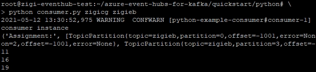 | python consumer.py [consumer group] [topic] python consumer.py zigicg zigieg |