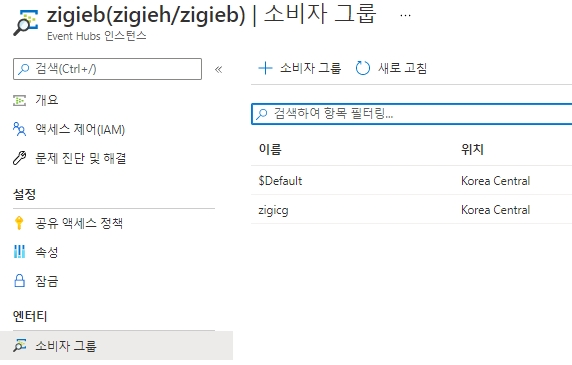 Event hubs 인스턴스에서, zigicg라고 이름의 consumer group을 미리 생성해둡니다.