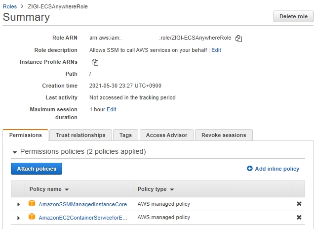 IAM Role에 ECS Anywhere 외부 인스턴스 등록을 위해서는 아래의 2개 정책을 추가합니다.