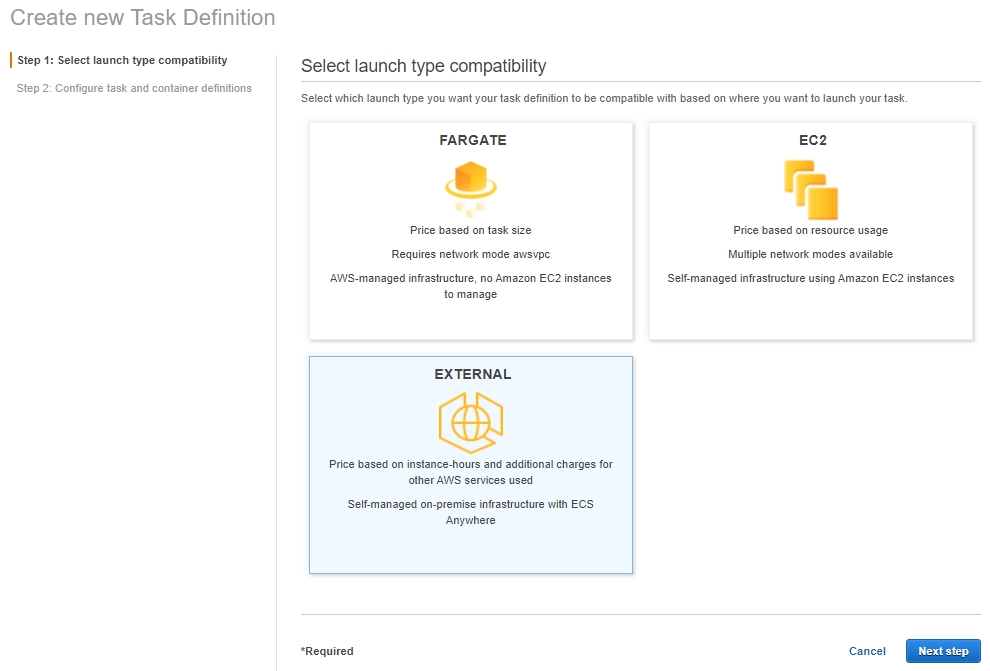 Task 정의 1단계로 ECS Anywhere에 올릴 Task의 Launch type을 선택합니다.