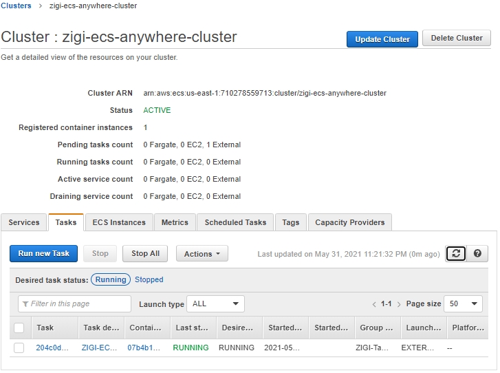 그리고 외부 인스턴스를 등록한 ECS 클러스터(zigi-ecs-anywhere-cluster)를 선택합니다.