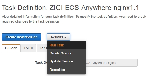 Task 정의 메뉴에서 방금 전에 생성한 Task 정의(ZIGI-ECS-Anywhere-nginx1)을 선택하면,