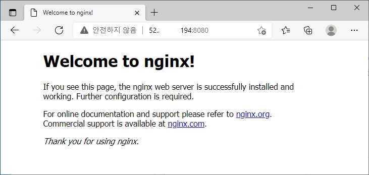 ECS Anywhere의 외부 인스턴스의 공인 IP로 웹 접속을 해보면, Task 정의로 만들었던 nginx 페이지가 정상적으로 열리는 것을 확인 할 수 있습니다.