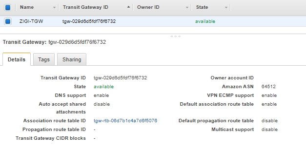 다음은 ZIGI-VPC1과 ZIGI-VPC2 를 연결 할 Transit Gateway 입니다.
