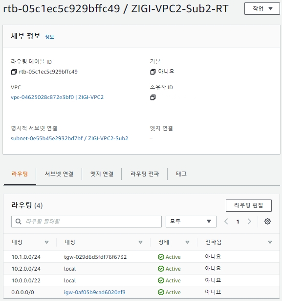 현재 ZIGI-TGW에 연결된 VPC1-Attachment와 VPC2-Attachment에 적용된 라우팅 테이블인 ZIGI-TGW-RT를 보겠습니다.