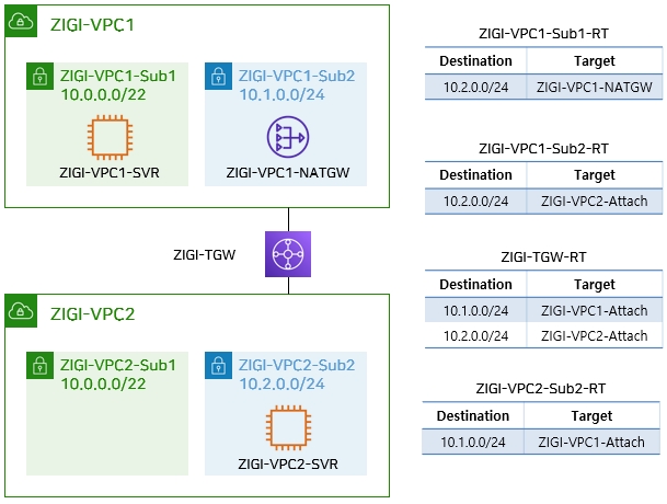 Transit Gateway를 이용해서, ZIGI-VPC1-과 ZIGI-VPC2를 연결하고,