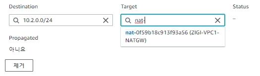 ZIGI-VPC2-Sub2 서브넷 대역인 10.2.0.0/24에 대한 Target을 처음에 만든 Private NAT Gateway인 ZIGI-VPC1-NATGW로 설정합니다.