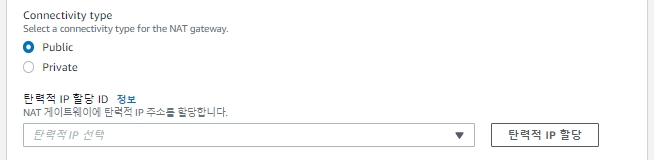 추가로 'Connectivity type'을 'Public'과 'Private'으로 선택 할 수 있습니다.