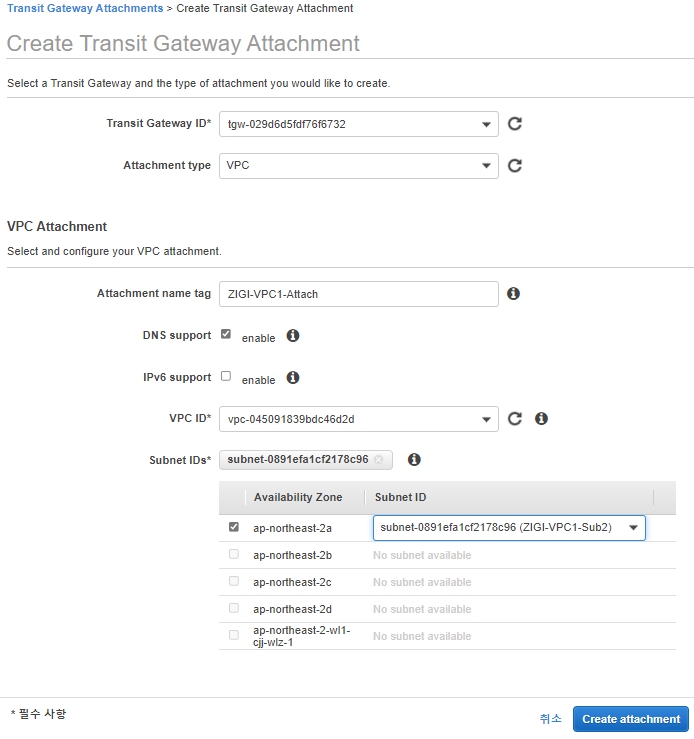 마찬가지로 VPC Attachment로 연결 할 Subnet은 Transit Gateway를 통해 연결 할 수 있는 Sub2를 선택합니다.