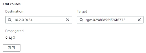 여기에서는 Transit Gateway로 연결 할 Sub2의 대역에 대해서만 각각의 VPC로 라우팅 되도록 설정합니다.
