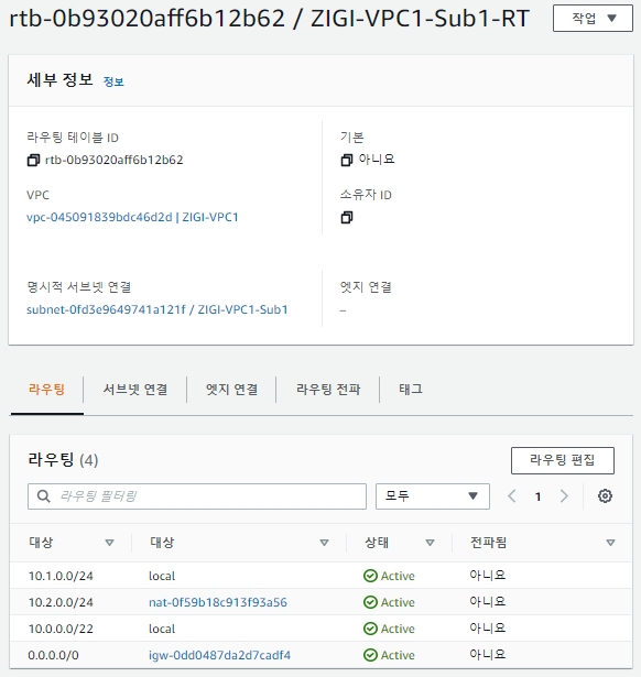 이제 ZIGI-VPC1과 ZIGI-VPC2에서 라우팅 설정을 합니다.