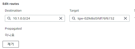 여기에서는 Transit Gateway로 연결 할 Sub2의 대역에 대해서만 각각의 VPC로 라우팅 되도록 설정합니다.