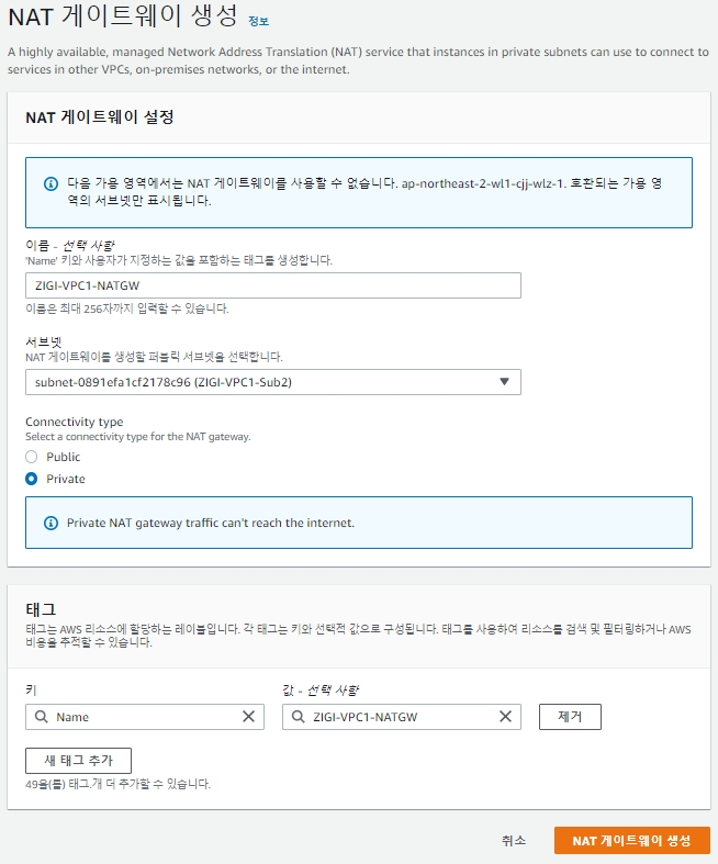 원하는 Tag가 있다면 추가로 입력을 하고, 'NAT 게이트웨이 생성'을 클릭합니다.