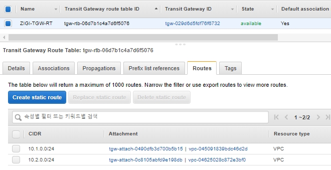 현재 ZIGI-TGW에 연결된 VPC1-Attachment와 VPC2-Attachment에 적용된 라우팅 테이블인 ZIGI-TGW-RT를 보겠습니다.