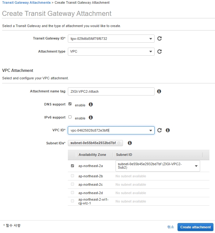 마찬가지로 VPC Attachment로 연결 할 Subnet은 Transit Gateway를 통해 연결 할 수 있는 Sub2를 선택합니다.