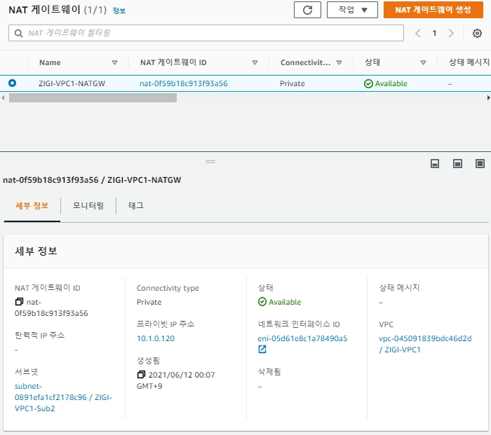 NAT Gateway IP 주소는 ZIGI-VPC1-Sub2 서브넷 대역에 포함되는 10.1.0.120 입니다.