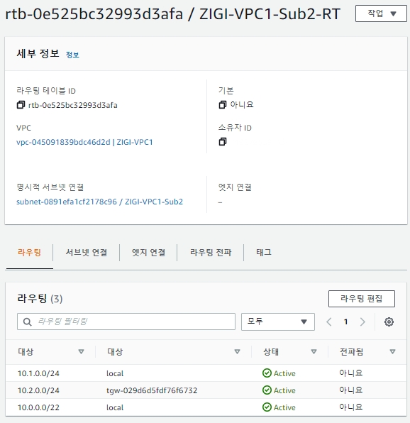 다음은 ZIGI-VPC2-Sub2의 라우팅 테이블에서 ZIGI-VPC1-Sub2와 통신하기 위해 ZIGI-VPC1-Sub2 대역(10.1.0.0/24)에 대해서 Transit Gateway로 향하도록 설정합니다.