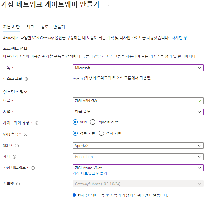 모든 설정이 끝나고 나면, 현재 설정한 값을 검토 후에 '만들기' 버튼을 클릭해서 가상 네트워크 게이트웨이를 생성합니다.