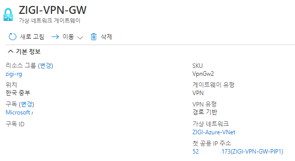 생성된 가상 네트워크 게이트웨이를 아래와 같이 확인 할 수 있습니다.