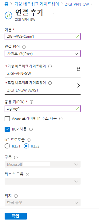 AWS VPN 연결의 터널에서 설정한 값과 동일하게 VPN 연결을 위한 키 값(zigikey1)을 입력합니다.