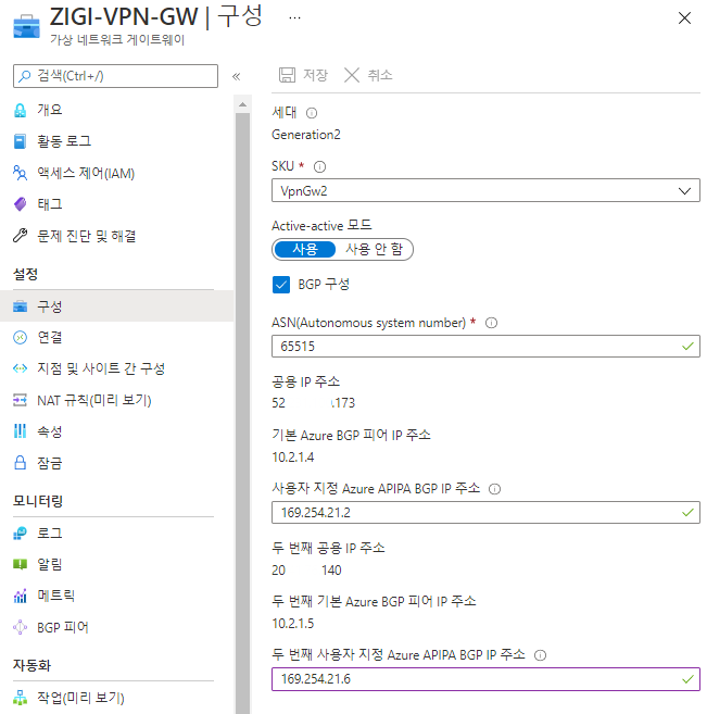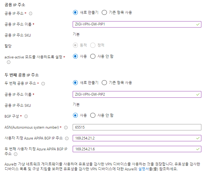 AWS와 연동 시에, APIPA를 이용해서 연동해야 하기 때문에 Azure APIPA BGP IP 주소도 함께 설정합니다.