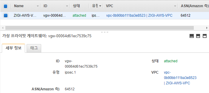 정상적으로 가상 프라이빗 게이트웨이가 'attached' 상태로 변경된 것을 볼 수 있습니다.