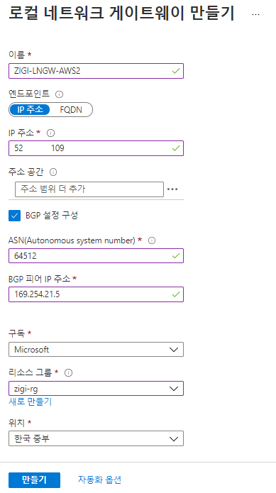 두 번째, 로컬 네트워크 게이트웨이(Local Network Gateway)를 설정합니다.