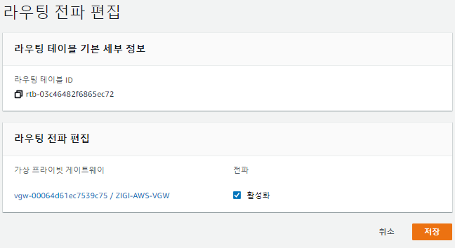 AWS의 가상 머신이 있는 라우팅 테이블에서 가상 프라이빗 게이트웨이를 통해서 라우팅을 전파 받을 수 있도록 '활성화'합니다.