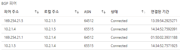 또한, BGP 피어 상태를 보면, AWS와 Azure 간의 BGP 연결 상태도 확인이 가능합니다.