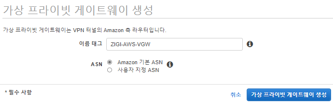 가상 프라이빗 게이트웨이 생성 시에는 BGP 연결에 사용하는 ASN을 설정하는 데,