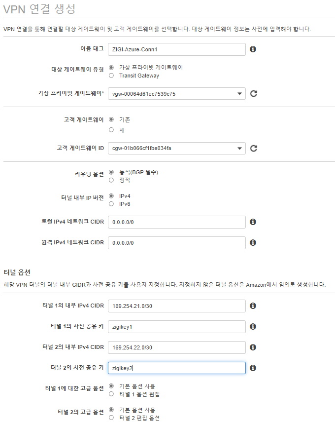 AWS VPN 연결의 터널에서 설정한 값과 동일하게 VPN 연결을 위한 키 값(zigikey1)을 입력합니다.