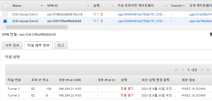 현재는 AWS만 설정이 완료된 상태이기 때문에, 하단의 세부 정보에 IPSec이 아직 연결 전이고, 상태가 작동 중지임을 볼 수 있습니다.