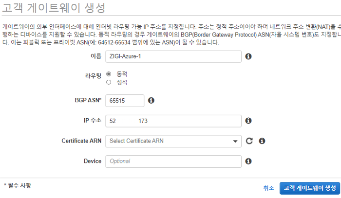 고객 게이트웨이에는 AWS와 연결 될 Azure의 가상 네트워크 게이트웨이의 ASN과 VPN 연결을 위한 IP 주소를 입력합니다.