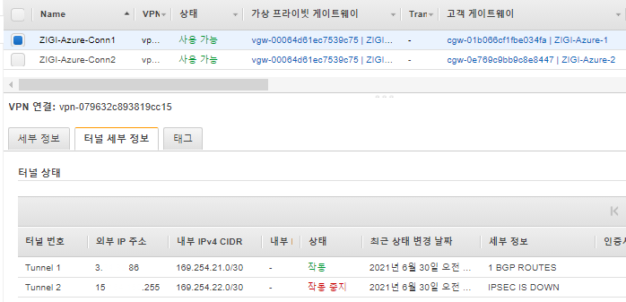 각 연결에서, 하단의 '터널 세부 정보' 탭을 선택하면, 터널 별로 VPN 연결을 위한 외부 IP 주소(공인)를 확인할 수 있고